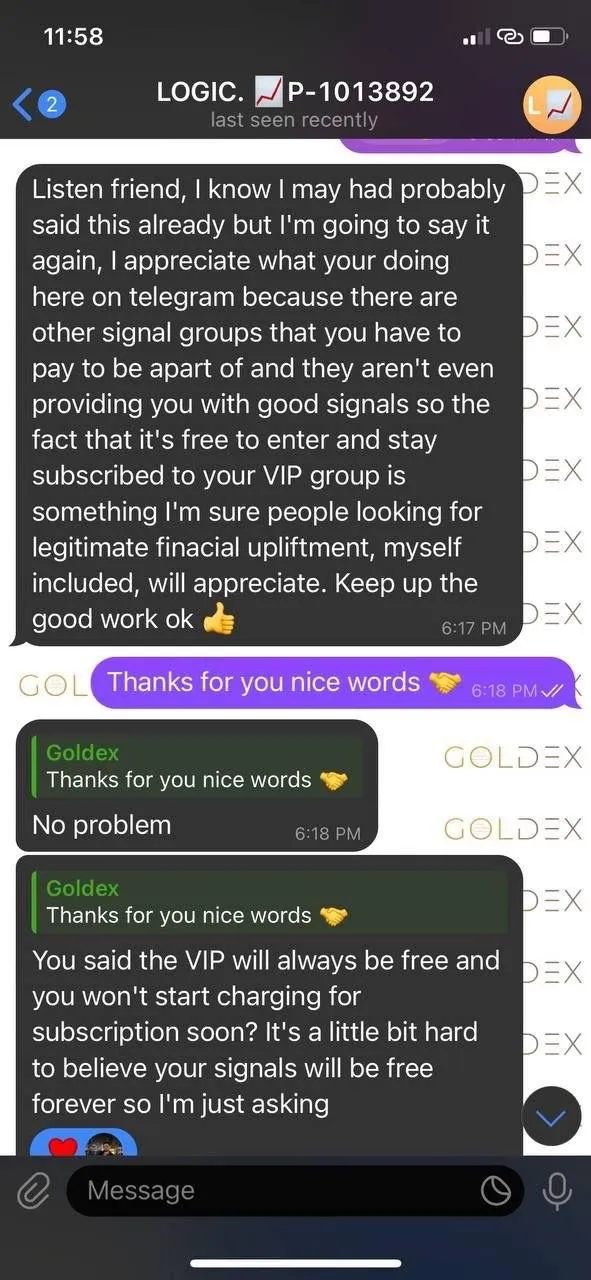 Goldex is the man! Honestly great group i would say what makes this different is transparency along with safe trades this guy will not give you a signal just for the sake of it and will not make you blow your account. Safe trade with small SL. Of course its always winning but the ratio is very good and if you use the SL and TP he provides you can make back the lost trades.